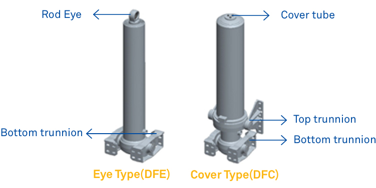 The Cover Type Cylinder requires mounting on fixed (bottom) and floating (top) trunnions. The cylinders are sturdier and best suited for both short and long chassis tippers.
